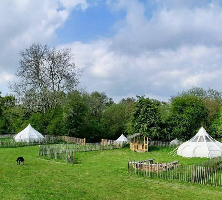 Here are our latest additions of unique lotus flower-shaped bell tents, situated in Grassy field. They are very spacious inside and are on very generous pitches with everything you need. To get an idea of where they sit in the field have a look at our campsite map. These bell tents are an ideal way for groups where one to four families would like to glamp but be in the same field as friends who have their own tents (but not directly next to as glamping wouldn’t be glamping without a little privacy!)