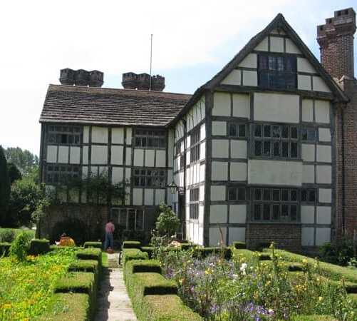 During the period known as the ‘second great rebuilding’ in the 17th century it was reduced in size and the timber framing on the South and West sides the weather fronts were covered with fine brickwork, with the magnificent chimney stacks erected. A notable feature of the chimney stacks is that they were constructed to present a corner angle to the prevailing wind.